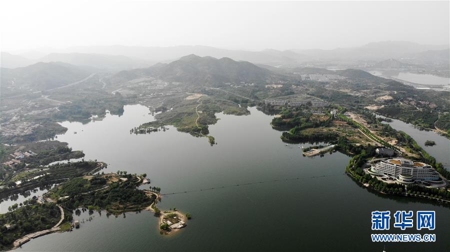 這是5月17日拍攝的雪野湖景色(無人機照片)。山東濟南風(fēng)景區(qū)——雪野湖波光粼粼,岸邊綠樹環(huán)抱,加上星星點點的帆船在湖面搖曳,景色宜人。新華社記者王凱攝