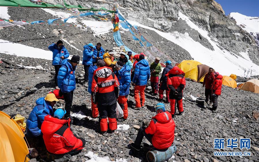 這是在海拔6500米的珠峰前進營地拍攝的公布2020珠峰高程測量12人沖頂隊員名單現(xiàn)場(5月18日攝)。新華社特約記者扎西次仁攝