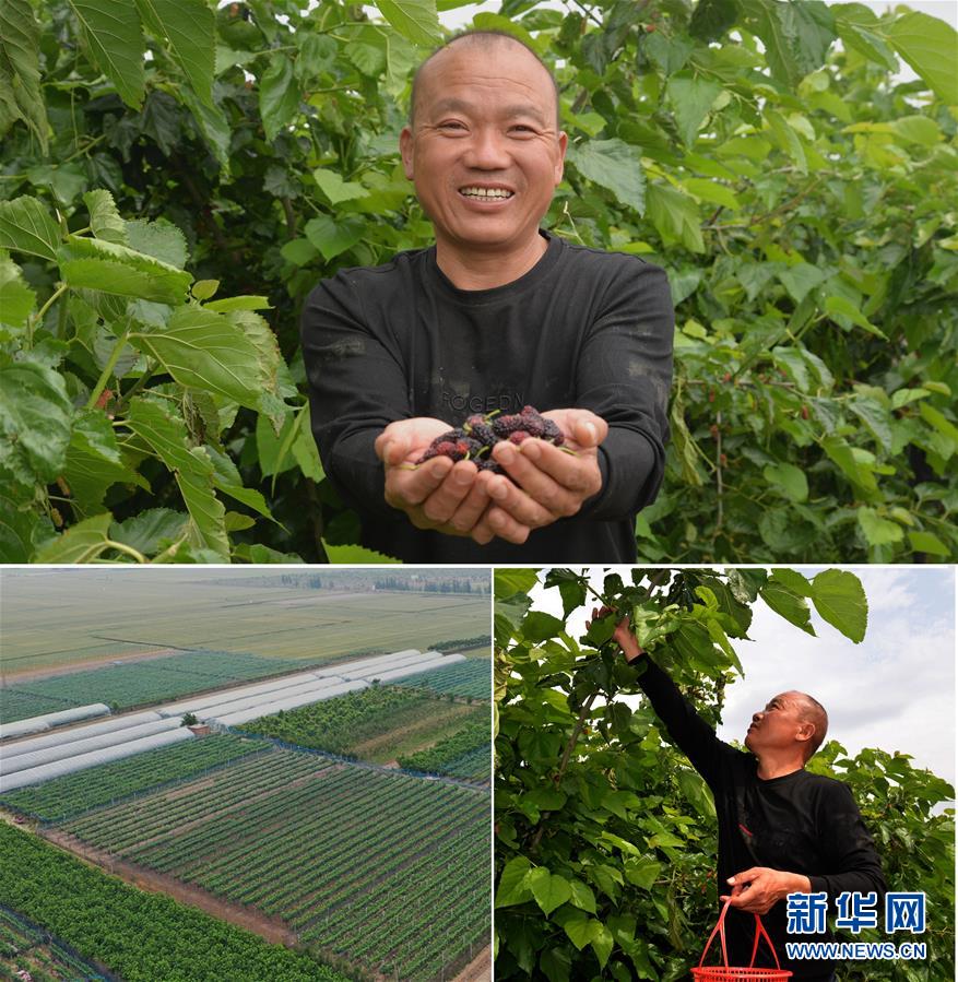 這是一張拼版照片(圖片均為5月16日攝)。上圖:河南省開封市尉氏縣大橋鄉(xiāng)十里鋪村村民孫根馬展示采摘的桑葚;下左圖:在扶貧政策扶持下,孫根馬流轉(zhuǎn)60多畝土地種植桑葚、葡萄、無花果等(無人機(jī)照片);下右圖:孫根馬在他經(jīng)營的桑葚種植園內(nèi)采摘桑葚。新華社記者孫清清攝