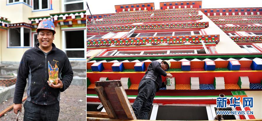 拼版照片:左圖為西藏昌都市卡若區(qū)卡若鎮(zhèn)卡若村村民洛松郎直;右圖為洛松郎直在昌都市一處建筑工地進行外墻彩繪作業(yè)。洛松郎直從小就喜歡畫畫,由于家境貧寒,初中畢業(yè)后,他回到家里干農(nóng)活、放牧,挑起家庭重擔(dān),但一直沒有放棄畫畫的夢想。后來,洛松郎直前往卡若區(qū)拉多鄉(xiāng)學(xué)習(xí)唐卡繪畫,技藝得到很大提高。2017年,洛松郎直為卡若區(qū)一個周轉(zhuǎn)房建設(shè)項目繪制墻體彩繪。2018年,在村里的支持下,洛松郎直創(chuàng)辦了公司,承攬更多的藏式墻體彩繪工程(4月30日攝)。新華社記者詹彥攝