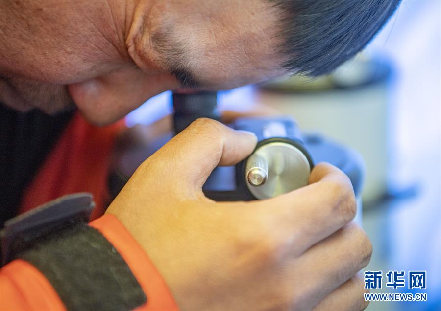 國測一大隊隊員在珠峰大本營測試地面測量中使用的重力儀(5月3日攝)。新華社記者晉美多吉攝