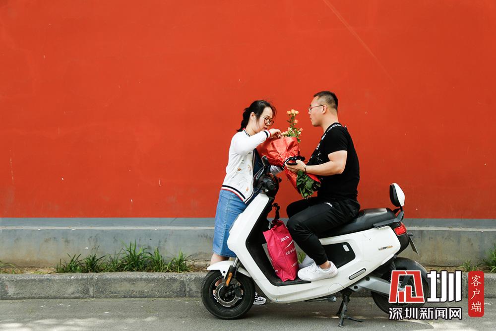 不過,在5月20日當(dāng)天來這里拍照的情侶或夫妻并不多,反倒有眾多“單身狗”與同性閨蜜一起,在“連心里”的路牌下、紅墻邊,手捧鮮花拍照打卡。