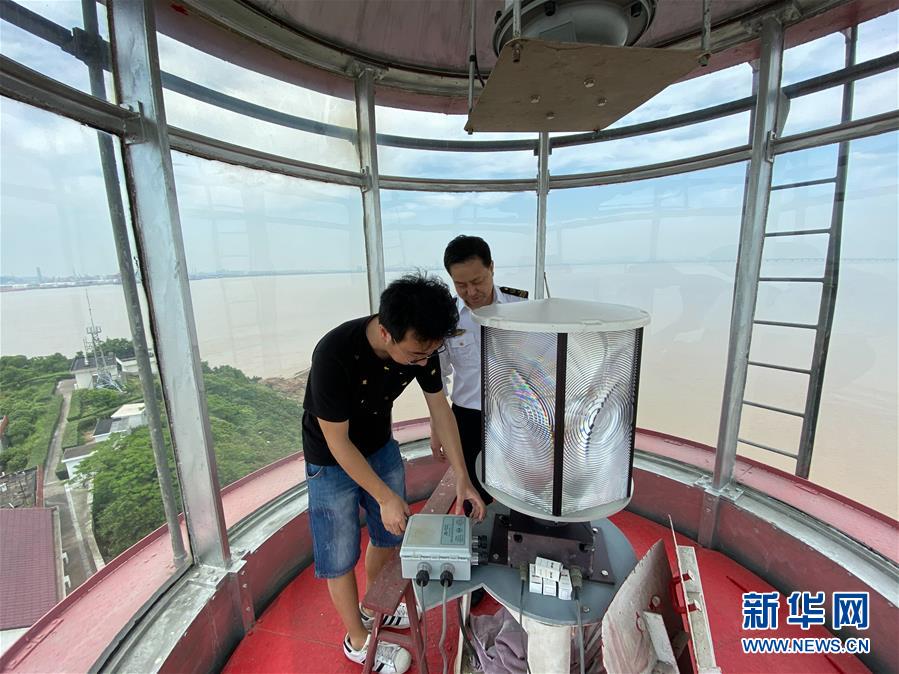 5月20日,在寧波七里嶼,葉家第五代燈塔工葉超群(左)和前來運(yùn)送物資的父親葉靜虎在燈塔上查看設(shè)備。葉超群2013年起在七里嶼燈塔工作,葉靜虎從燈塔工崗位上退下來后,目前在寧波航標(biāo)處后勤事務(wù)中心工作。新華社記者翁忻旸攝