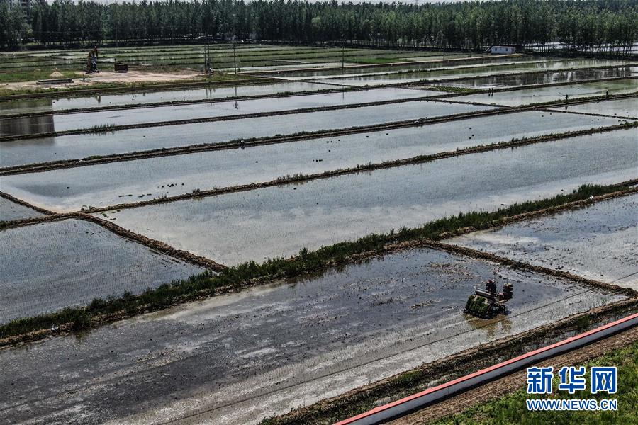 5月24日,盤錦市大洼區(qū)的農(nóng)民在駕駛插秧機(jī)插秧(無(wú)人機(jī)照片)。新華社記者潘昱龍攝