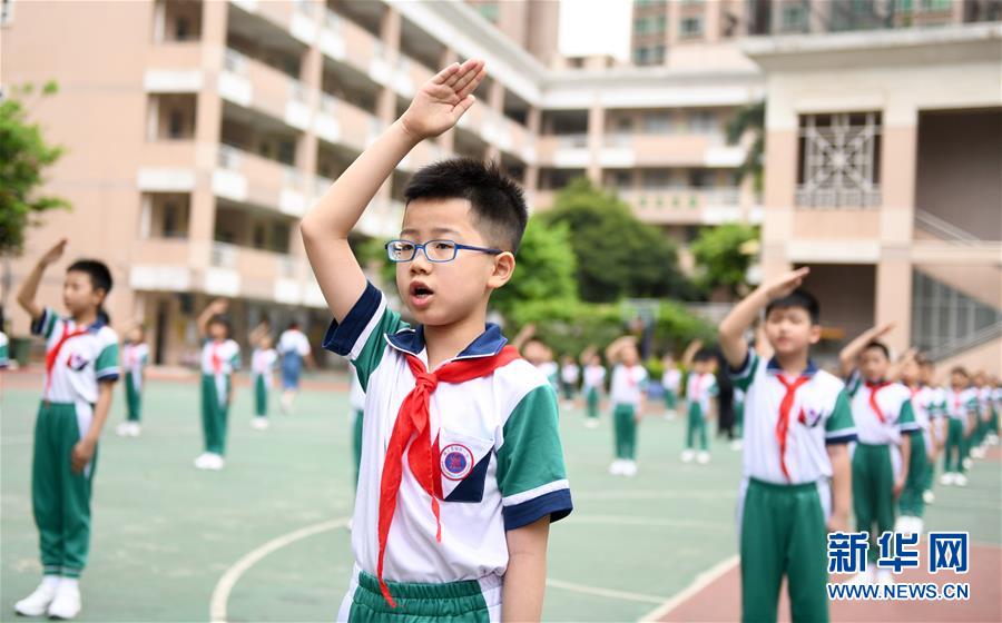 5月25日,廣州市荔灣區(qū)蔣光鼐紀念小學(xué)的學(xué)生在參加升國旗唱國歌儀式。當日,廣州市各小學(xué)一至三年級學(xué)生正式開學(xué)復(fù)課。至此,廣州市中小學(xué)各年級已全部開學(xué)復(fù)課。新華社記者盧漢欣攝