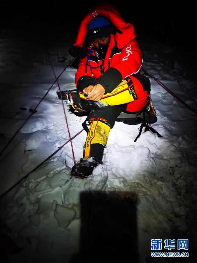5月27日,2020珠峰高程測(cè)量登山隊(duì)隊(duì)員正在穿戴登山裝備。新華社特約記者扎西次仁攝