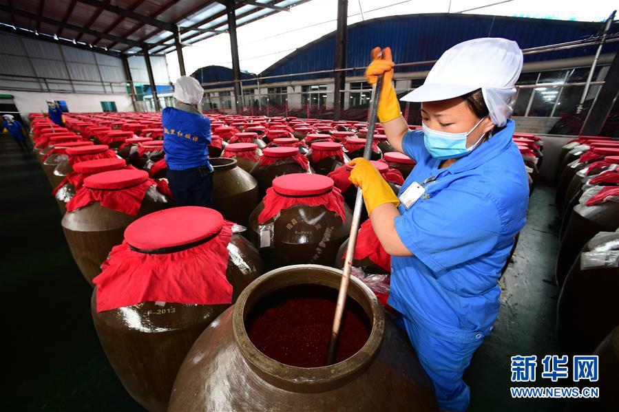 5月26日,工人在貴州省黔東南苗族侗族自治州麻江縣明洋食品公司生產車間攪拌釀造過程中的酸湯原料。