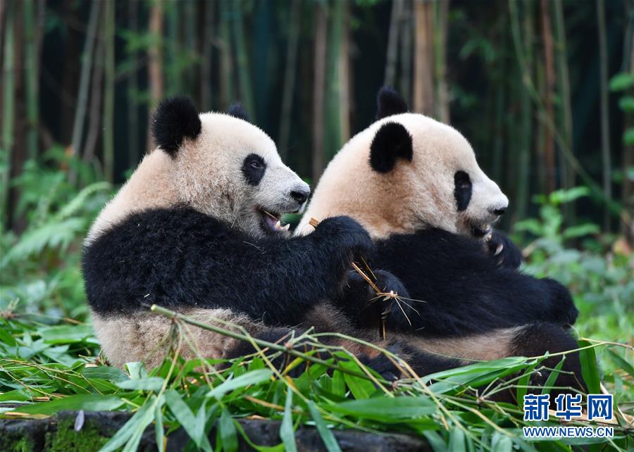 5月27日,大熊貓婷仔和隆仔在享受竹子大餐。正在享受竹子大餐的廣州長隆野生動物世界大熊貓婷仔被大熊貓隆仔搶食,兩只大熊貓上演一場爭食戲碼。新華社記者劉大偉攝