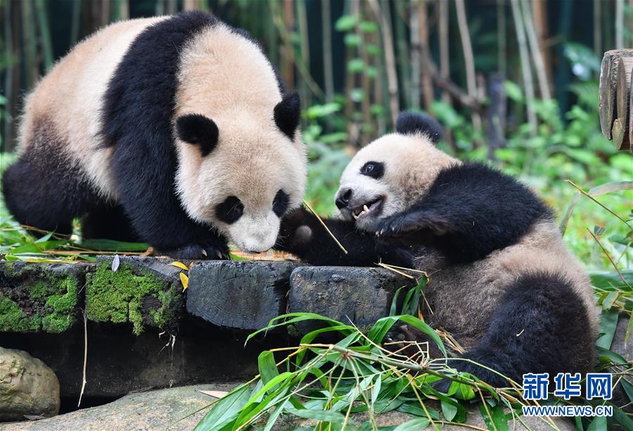 5月27日,大熊貓隆仔(左)突然出手,搶走婷仔的竹子。正在享受竹子大餐的廣州長隆野生動(dòng)物世界大熊貓婷仔被大熊貓隆仔搶食,兩只大熊貓上演一場爭食戲碼。新華社記者劉大偉攝