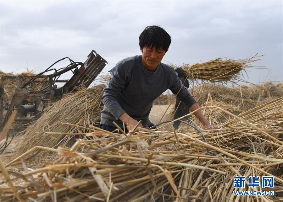 5月20日,在新疆博湖縣西南河口葦場(chǎng),工人搬運(yùn)蘆葦。新華社記者宋彥樺攝