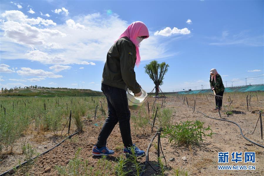 5月28日,工人在巴丹吉林鎮(zhèn)生態(tài)修復(fù)項(xiàng)目南部河道附近播撒草種。2017年以來,內(nèi)蒙古阿拉善右旗在巴丹吉林鎮(zhèn)開展生態(tài)修復(fù)項(xiàng)目,種植適合在當(dāng)?shù)厣L的馬蓮、紅柳等植物,修復(fù)生態(tài)的同時也起到美化作用。巴丹吉林鎮(zhèn)是巴丹吉林沙漠旅游景區(qū)的游客集散地,這里常年干旱少雨,水資源匱乏。新華社記者徐欽攝