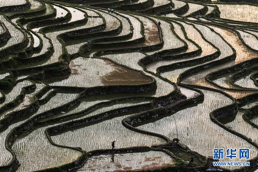 村民從從江縣加榜鄉(xiāng)黨扭梯田上經(jīng)過(5月26日攝)。夏日時節(jié),位于貴州省黔東南苗族侗族自治州從江縣加榜鄉(xiāng)加車、加頁、黨扭等苗寨的梯田在晨霧與陽光的映襯下線條分明,光影變幻,景色如畫。新華社記者 楊文斌 攝