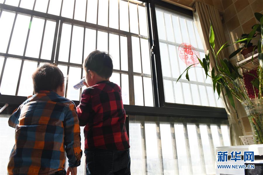合肥第二人民醫(yī)院附近,兒子在家中陽臺手持自制“放大鏡”,眺望在對面醫(yī)院“打病毒”的護(hù)士媽媽(2月3日攝)。新華社記者張端攝