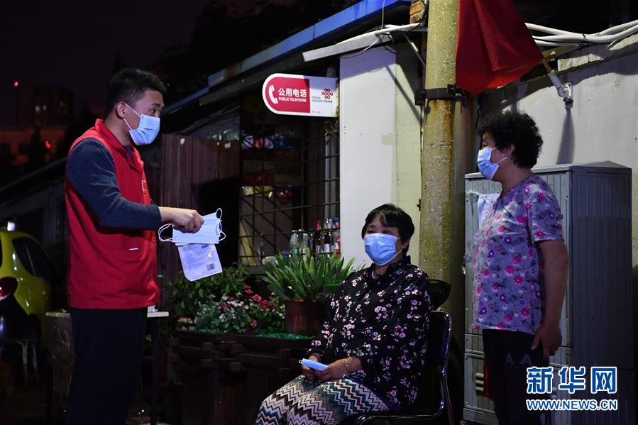 楊龍明在小區(qū)內(nèi)給住戶發(fā)放口罩(6月1日攝)。新華社記者李然攝。