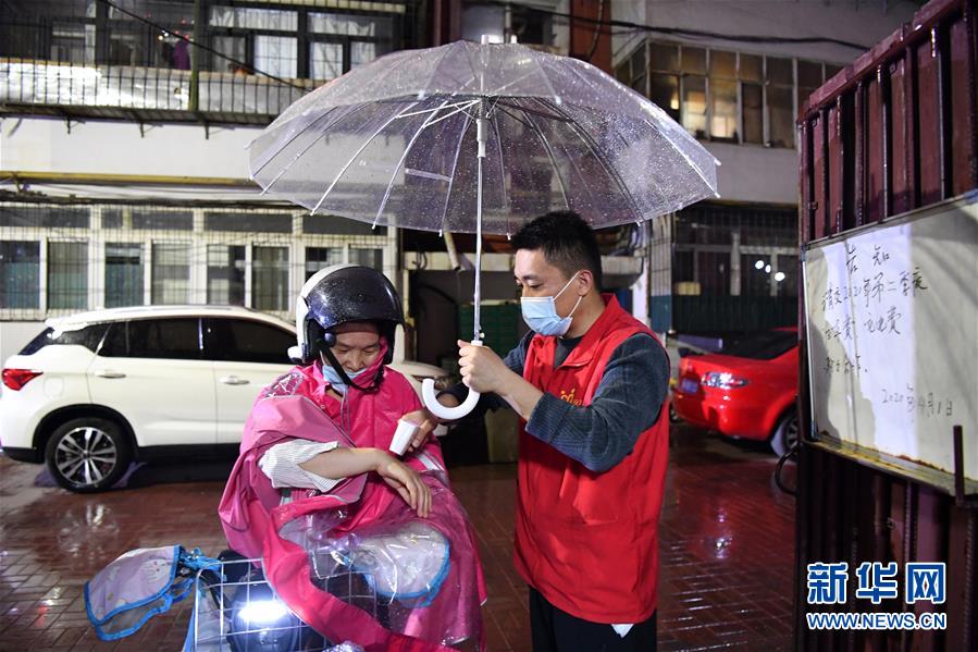 楊龍明在小區(qū)內(nèi)給住戶檢測體溫(6月1日攝)。新華社記者李然攝。