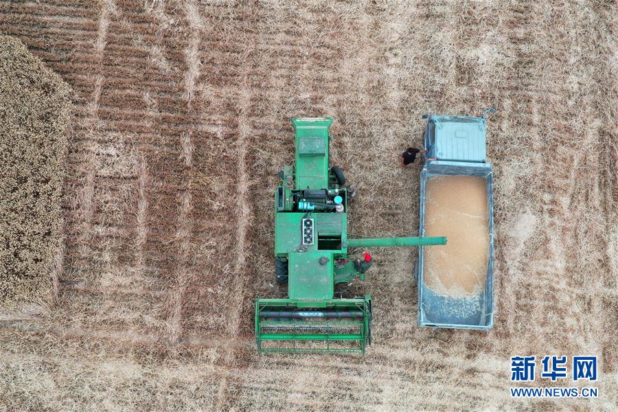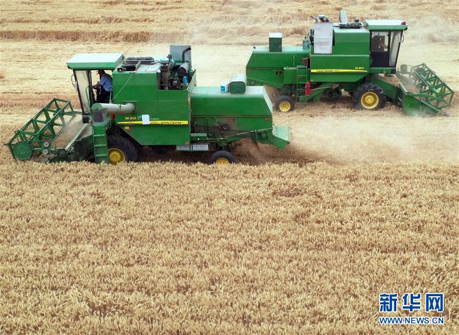 6月2日,在河南省黃泛區(qū)農(nóng)場(chǎng)九分場(chǎng)的麥田里,農(nóng)民操作大型收割機(jī)收獲小麥(無(wú)人機(jī)照片)。新華社記者李嘉南攝。