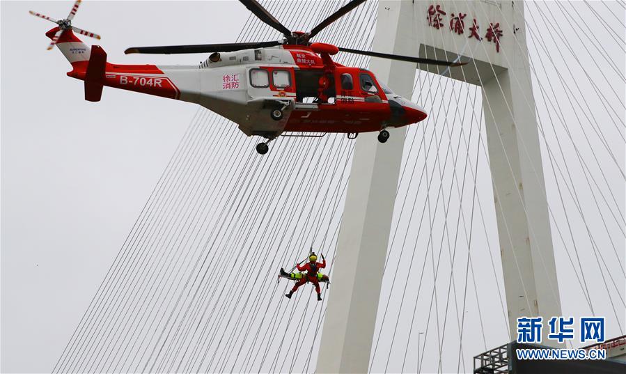 6月3日,航空救援直升機在演練中救起“傷員”。新華社記者方喆攝。
