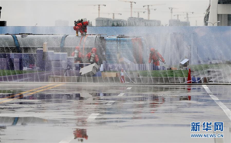6月3日,救援人員在演練中使用水幕阻擋危化品擴散。新華社記者方喆攝。