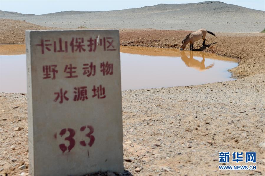 在新疆卡拉麥里山有蹄類野生動(dòng)物自然保護(hù)區(qū),一匹普氏野馬來(lái)到33號(hào)水源地飲水(6月3日攝)。新華社記者丁磊攝。