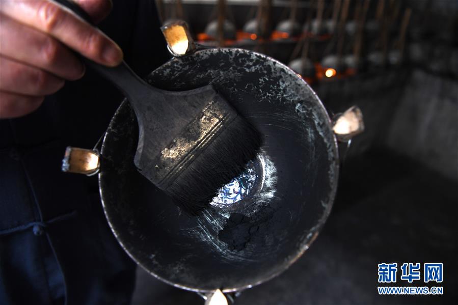 5月21日,安徽省非物質文化遺產(chǎn)徽墨代表性傳承人項德勝收集集煙碗中的桐油煙灰。新華社記者張端攝。