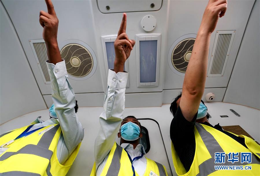 6月5日,實習(xí)指導(dǎo)教師帶領(lǐng)伊迪內(nèi)卡邱(中)和特瑞薩(左)練習(xí)標(biāo)準(zhǔn)化一次乘務(wù)作業(yè)。 新華社記者 李安 攝
