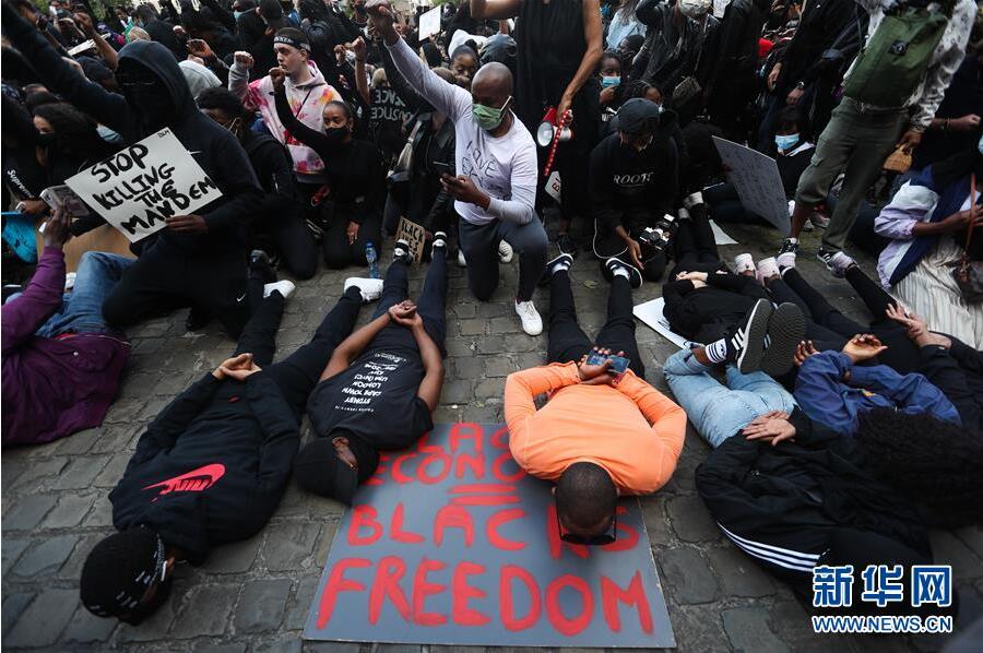 6月7日,民眾在比利時布魯塞爾市中心的司法宮附近參加示威活動。比利時民眾當(dāng)日在布魯塞爾市中心的司法宮附近舉行示威活動,抗議美國明尼阿波利斯市警察暴力執(zhí)法致非裔男子喬治·弗洛伊德死亡。新華社記者鄭煥松攝