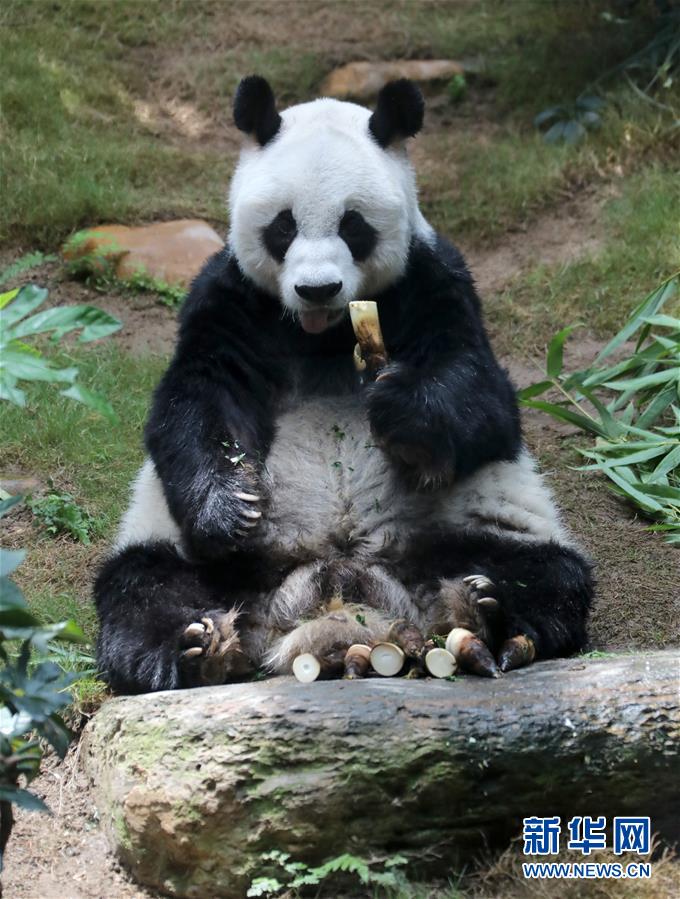 在香港海洋公園,大熊貓“安安”坐在小山坡上進(jìn)食(5月11日攝)。新華社記者吳曉初攝