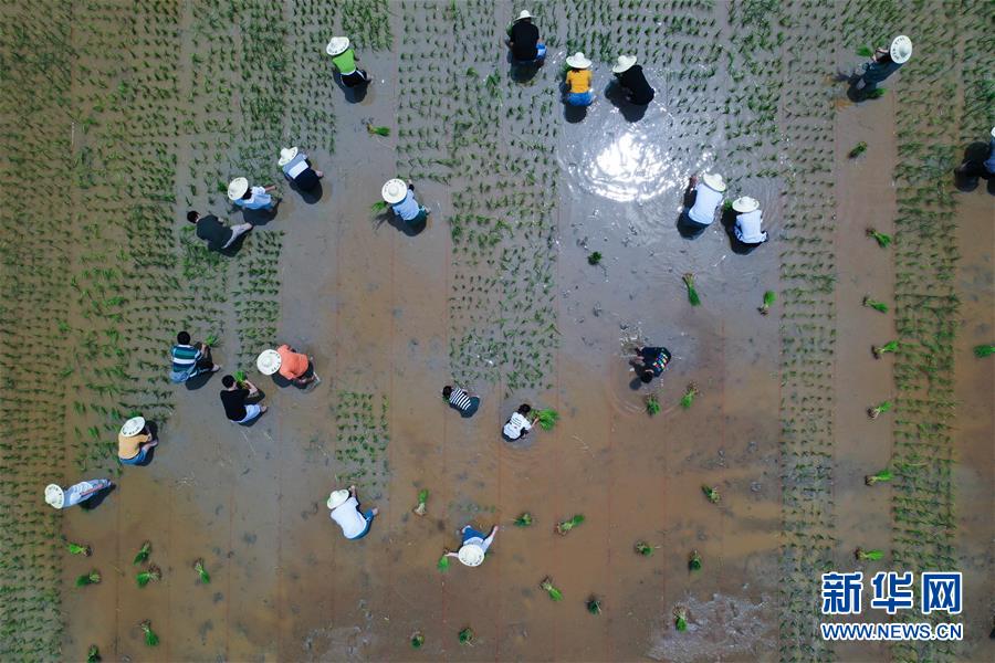 6月7日,孩子和家長(zhǎng)們體驗(yàn)稻田插秧(無人機(jī)照片)。新華社記者徐昱攝