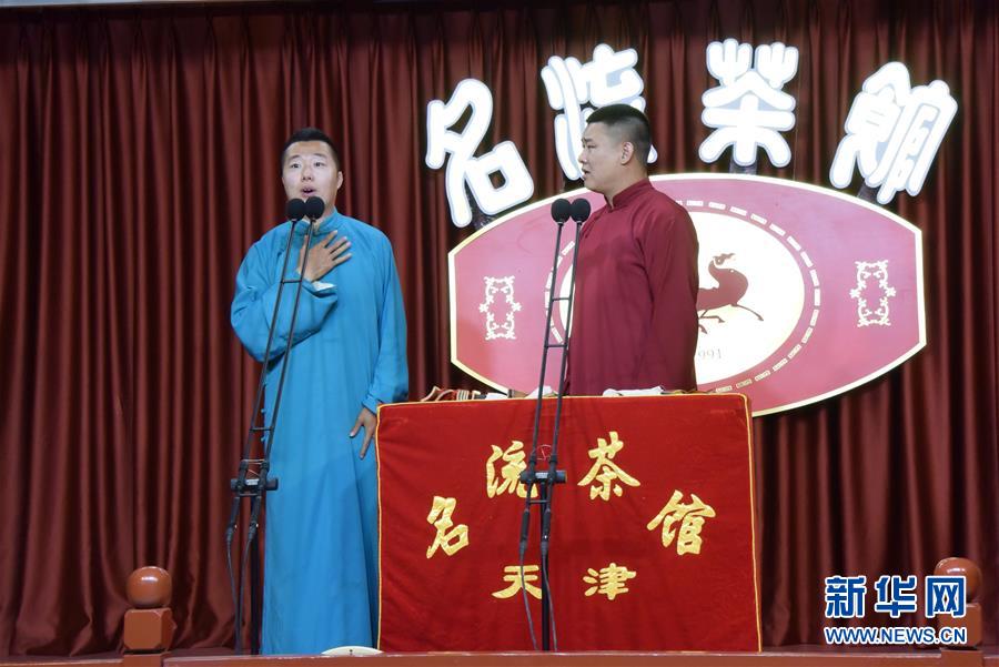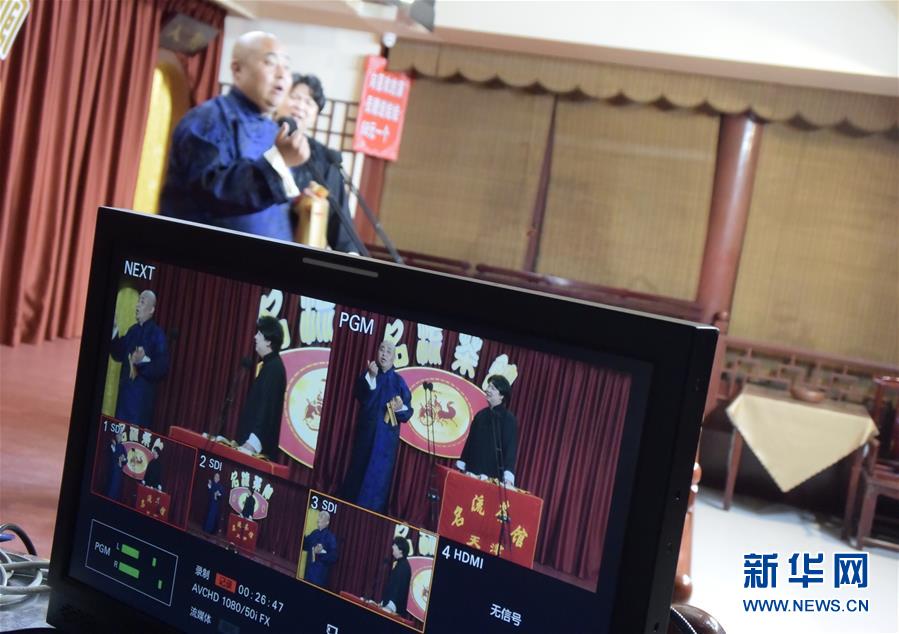 6月6日晚,天津名流茶館的相聲演員在付費直播《名流名家“逗你玩”》演出中說相聲。隨著疫情防控形勢逐漸向好,天津的一些茶館紛紛轉(zhuǎn)戰(zhàn)“云端”說相聲,推出付費直播演出,并邀請一些幸運觀眾到現(xiàn)場觀看,在傳播津味相聲、培養(yǎng)年輕觀眾的同時,也為即將到來的線下演出“預(yù)熱”。新華社記者周潤健攝