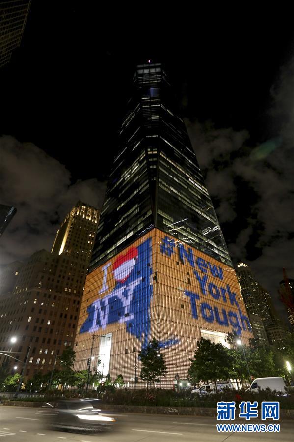 6月7日,美國紐約世貿(mào)中心一號樓外墻呈現(xiàn)出“我愛紐約”和“紐約堅強”字樣。新華社記者王迎攝