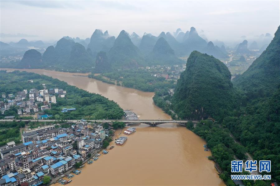 這是洪水奔流的漓江流過廣西陽朔縣境內(nèi)(6月8日攝,無人機照片)。6月6日至8日,廣西陽朔縣普降暴雨,局部降特大暴雨,全縣9個鄉(xiāng)鎮(zhèn)出現(xiàn)洪澇災害。目前,全縣正有序開展災后生產(chǎn)生活恢復。新華社記者陸波岸攝