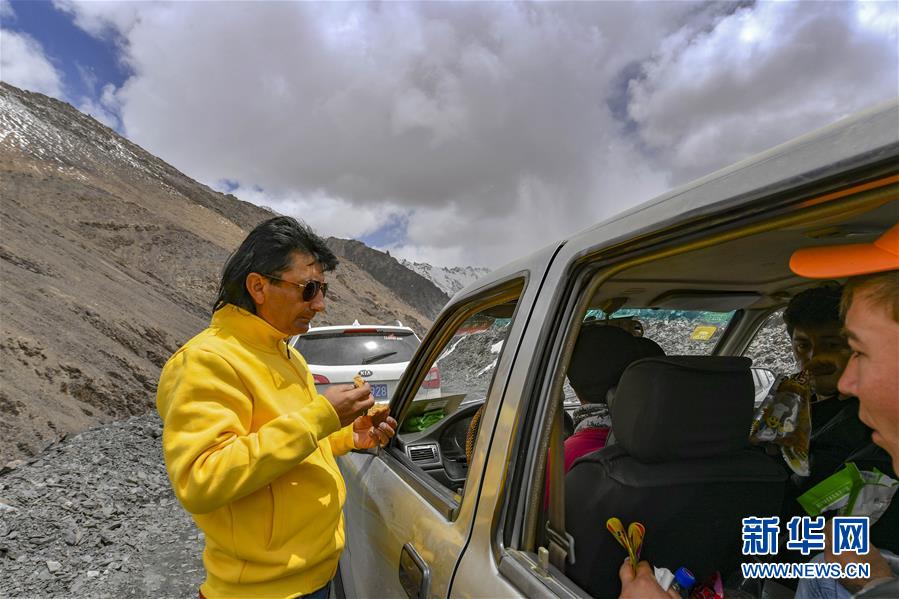 去往達布達爾鄉(xiāng)熱斯喀木村途中,塔縣文工團演員在吃干糧(6月5日攝)。新華社記者胡虎虎攝
