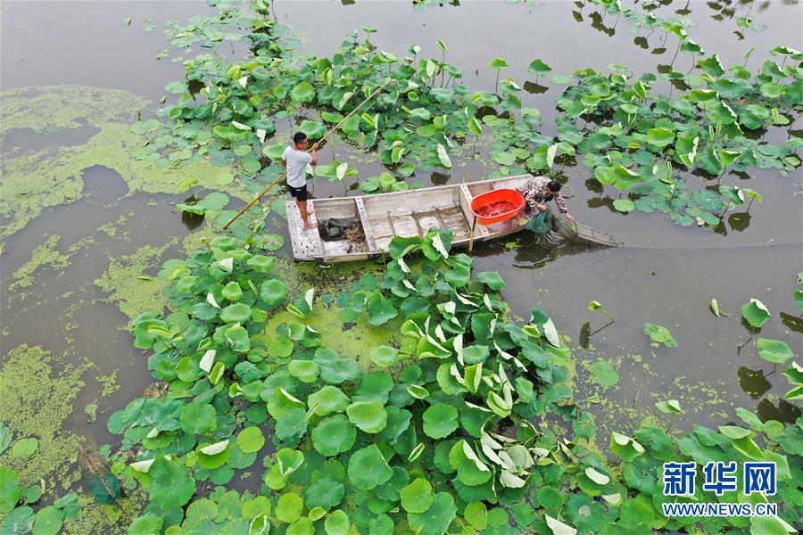 6月9日,在宿遷市宿城區(qū)中揚(yáng)鎮(zhèn)一家淺水藕套養(yǎng)小龍蝦合作社,負(fù)責(zé)人王乃國(右)在取蝦苗(無人機(jī)照片)。新華社記者季春鵬攝