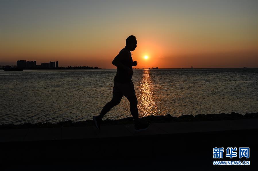 夜幕將至,一位市民在海口世紀(jì)公園濱海步道跑步(5月15日拍攝)。近年來(lái),夜跑成為越來(lái)越多都市人熱衷的健身方式之一。在海南??冢慨?dāng)夜幕降臨,“夜跑族”來(lái)到??谌f(wàn)綠園、世紀(jì)公園等夜跑場(chǎng)所跑步,用一身酣暢淋漓的汗水?dāng)[脫白天工作中的壓力,享受跑步帶來(lái)的歡愉。新華社記者 蒲曉旭 攝