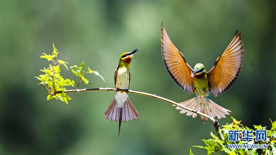 栗喉蜂虎在福建省晉江市深滬鎮(zhèn)科任村一山坡上覓食嬉戲(6月12日攝)。入夏以來,逾百只栗喉蜂虎飛臨閩南晉江市深滬鎮(zhèn)科任村筑巢棲息。新華社記者記者梅永存攝。
