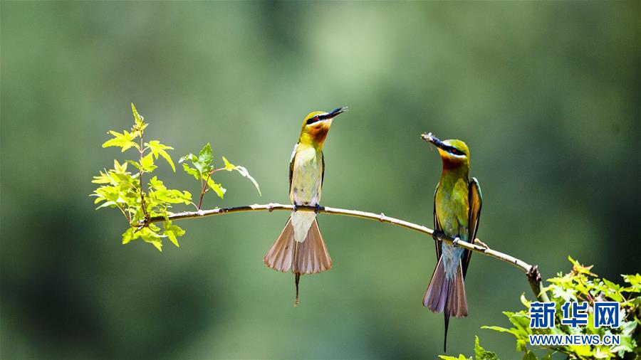 栗喉蜂虎在福建省晉江市深滬鎮(zhèn)科任村一山坡上覓食嬉戲(6月12日攝)。入夏以來,逾百只栗喉蜂虎飛臨閩南晉江市深滬鎮(zhèn)科任村筑巢棲息。新華社記者記者梅永存攝。