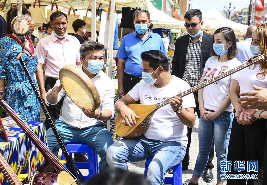 6月12日,在位于烏魯木齊大巴扎景區(qū)內(nèi)的活動(dòng)現(xiàn)場,游客在“維吾爾族樂器制作技藝”非遺項(xiàng)目展區(qū)體驗(yàn)民族樂器彈奏。6月12日,“文旅融合,文物賦彩,非遺傳承,健康生活”2020年烏魯木齊市天山區(qū)文化和自然遺產(chǎn)日推介展演活動(dòng)在大巴扎景區(qū)舉辦,吸引不少游客和市民觀賞。新華社記者王菲攝。