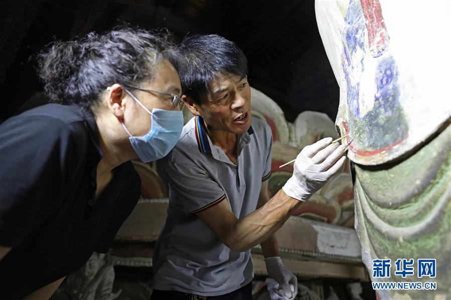 6月8日,工作人員對奉國寺的彩繪泥塑進行保護修復。新華社記者 姚劍鋒 攝