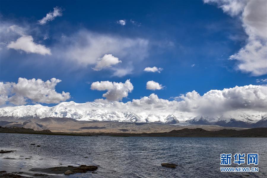 帕米爾高原上喀拉庫(kù)勒湖畔連綿的雪山(6月16日攝)。