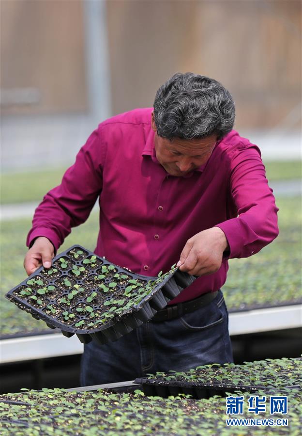 在遼寧省盤錦市大洼區(qū)新興鎮(zhèn)坨子里村,劉廣會在自己經(jīng)營的育苗企業(yè)內查看蔬菜種苗生長情況(6月9日攝)。新華社記者 楊青 攝