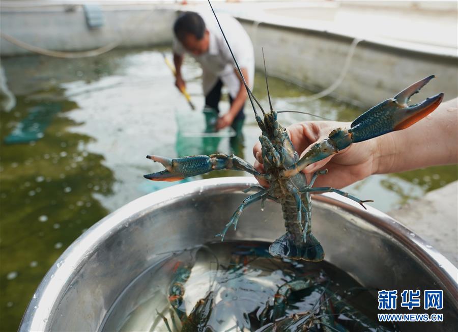 6月16日,在盧龍縣印莊鄉(xiāng)榆林甸村永新水產(chǎn)養(yǎng)殖專業(yè)合作社的養(yǎng)殖基地,養(yǎng)殖戶劉玉永在澳洲淡水龍蝦種蝦養(yǎng)殖池內(nèi)工作。新華社記者 楊世堯 攝