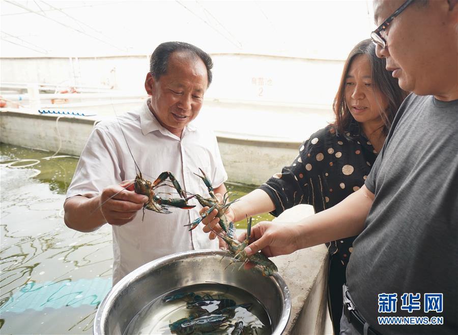 6月16日,在盧龍縣印莊鄉(xiāng)榆林甸村永新水產(chǎn)養(yǎng)殖專業(yè)合作社的養(yǎng)殖基地,養(yǎng)殖戶劉玉永(左)與河北省海洋與水產(chǎn)科學研究院科研人員探討澳洲淡水龍蝦養(yǎng)殖技術(shù)。新華社記者 楊世堯 攝