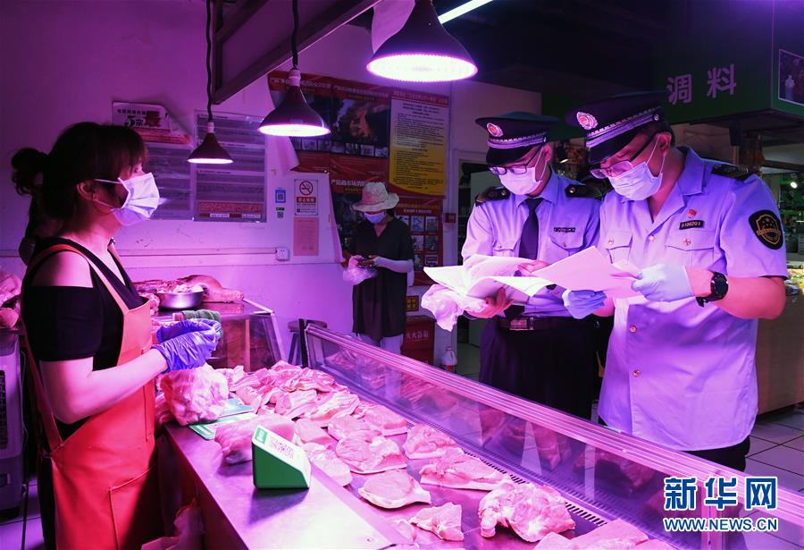 6月17日,在位于北京市海淀區(qū)的增光鴻運(yùn)市場(chǎng),執(zhí)法人員對(duì)商戶出售的鮮肉進(jìn)行檢查。新華社記者 任超 攝