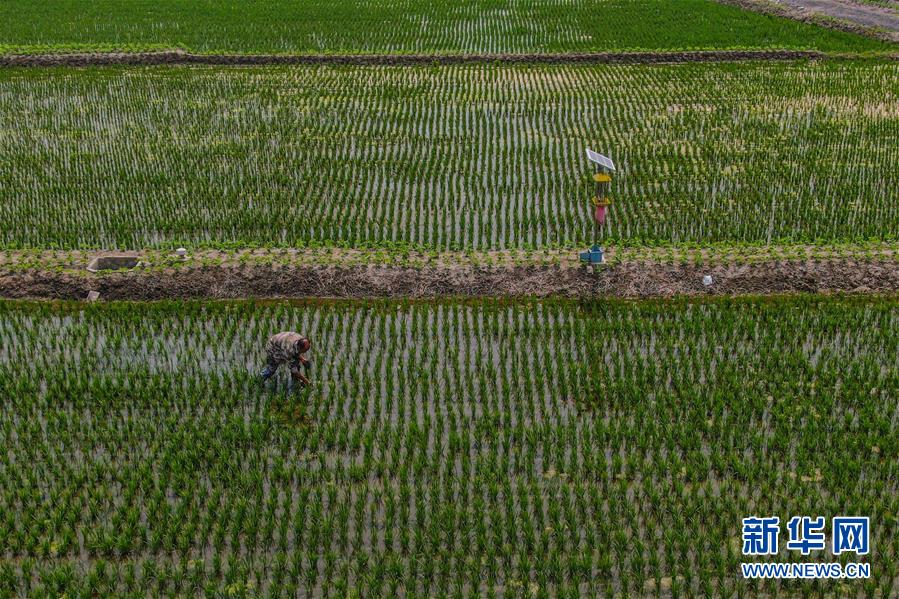 6月17日,農(nóng)民在盤錦市盤山縣太平街道張家村稻田間進行管護作業(yè)。新華社記者 潘昱龍 攝