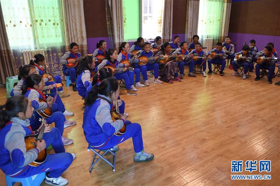 6月14日,孩子們在阿壩縣民族寄宿制小學(xué)內(nèi)的少年宮里用曼陀鈴進(jìn)行彈唱。新華社記者 劉坤 攝