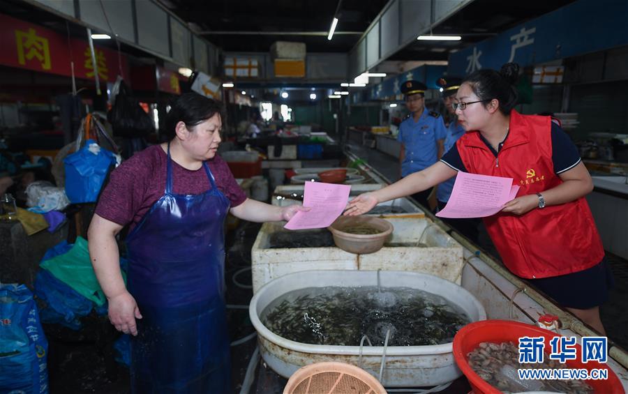 6月17日,黨員志愿者(右一)在東林鎮(zhèn)農(nóng)貿(mào)市場給經(jīng)營戶發(fā)放野生動物保護(hù)及禁食倡議書。新華社記者 徐昱 攝