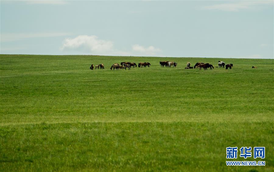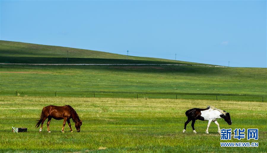 6月17日,馬兒在錫林郭勒盟烏拉蓋草原上吃草。初夏時節(jié),內(nèi)蒙古中部的錫林郭勒大草原風(fēng)景如畫。新華社記者連振攝