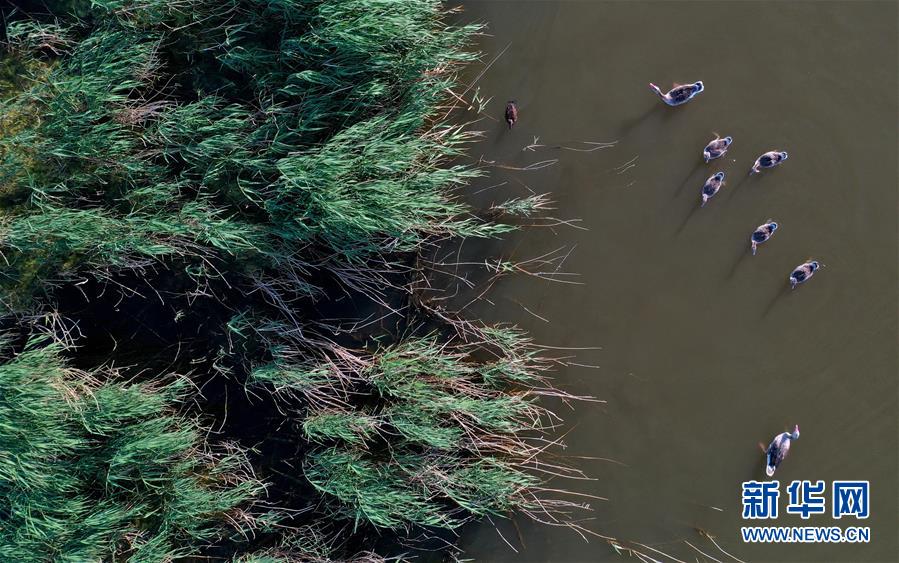 6月19日,一群鴨子在新疆烏倫古湖國(guó)家濕地公園覓食(無(wú)人機(jī)照片)。烏倫古湖國(guó)家濕地公園位于新疆阿勒泰地區(qū)福海縣城以西,由烏倫古湖和吉力湖兩部分組成。烏倫古湖濕地公園是遷徙候鳥飛越天山和阿爾泰山的“能量補(bǔ)充站”,良好的濕地生態(tài)吸引著大量遷徙鳥類在此集結(jié)成群,繁殖棲息,成為一道靚麗的風(fēng)景線。新華社記者 沙達(dá)提 攝