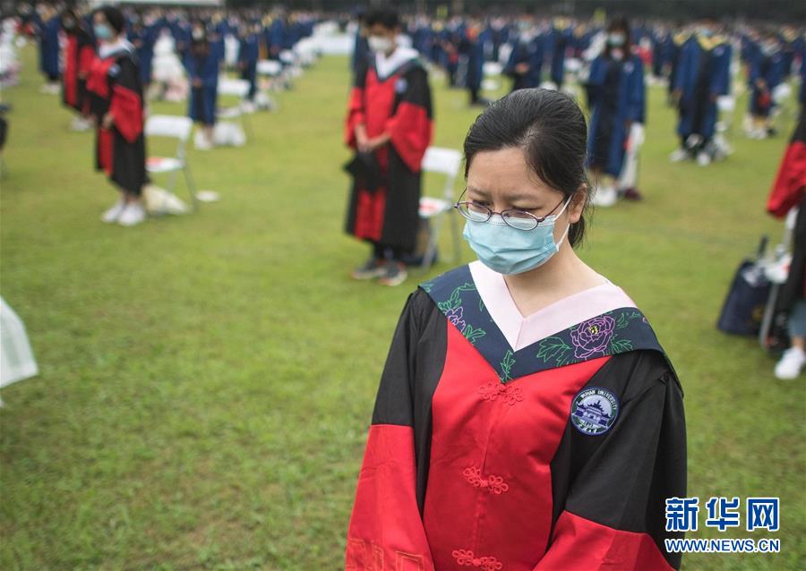 6月20日,在畢業(yè)典禮上,師生共同向新冠肺炎疫情犧牲烈士和逝世同胞默哀。