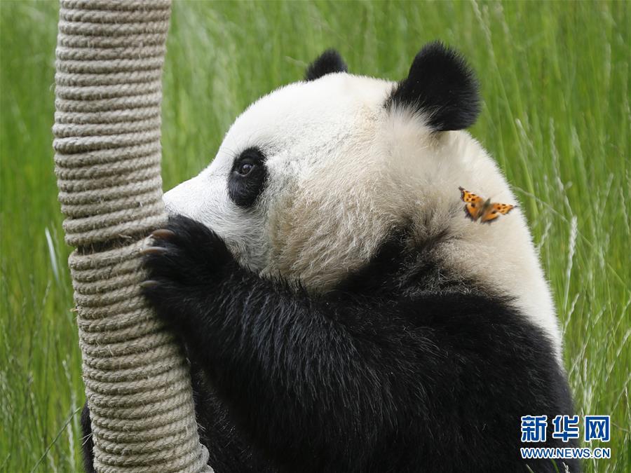 在位于四川省阿壩藏族羌族自治州的九寨溝大熊貓園,大熊貓“海海”在玩耍(6月19日攝)。新華社記者沈伯韓攝